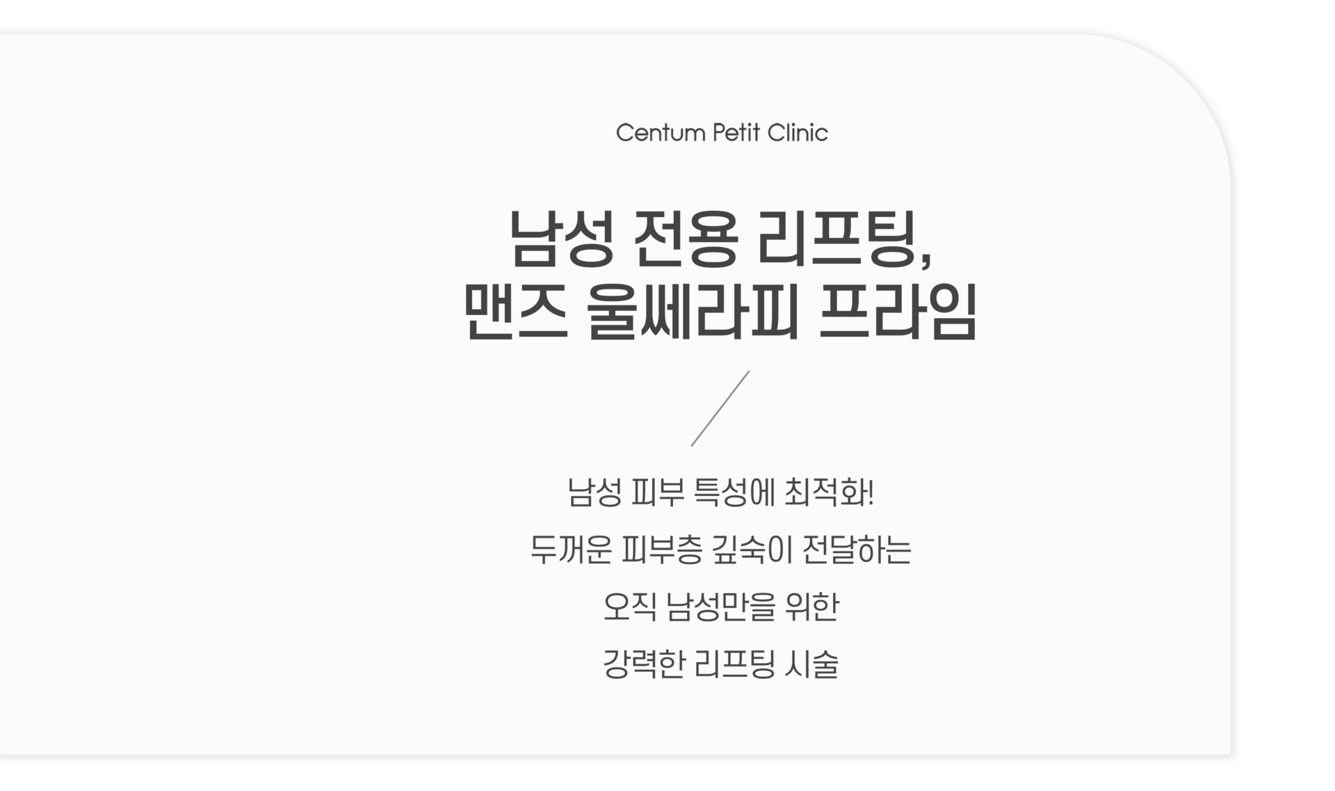 처진 턱선, 깊은 팔자주름, 눈가 처짐 등 남성 특유의 노화 고민을 분석하여 필요한 부위에 집중적으로 에너지를 전달하는 남성 전용 리프팅 시술입니다.